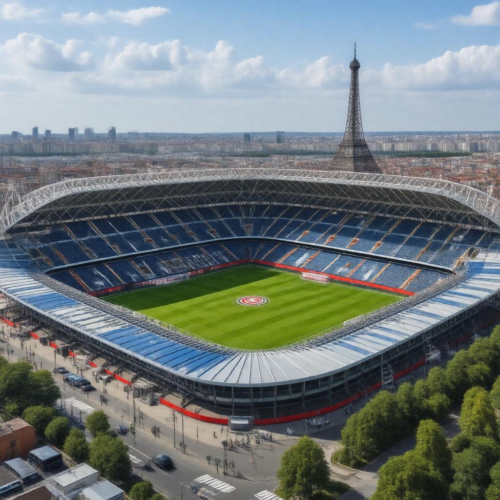 "Generate an image of a football stadium with a blue, red, and white color scheme, showcasing the iconic Parc des Princes in Paris, France, with a subtle hint of the Eiffel Tower in the background, and featuring the Paris Saint-Germain Football Club's logo prominently displayed, in a realistic and vibrant style."