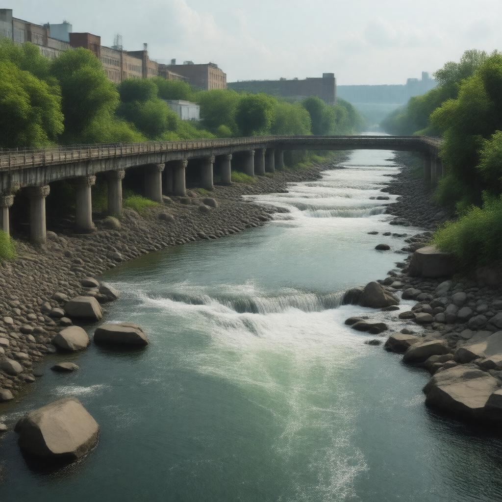 "Generate an image of a serene river flowing through a mix of urban and natural landscapes, with a notable waterfall in the background. The river should be surrounded by lush greenery and have several bridges crossing over it. Incorporate industrial and recreational elements to reflect the river's history and usage. Style: Realistic landscape. Subject: Passaic River, New Jersey, USA."
