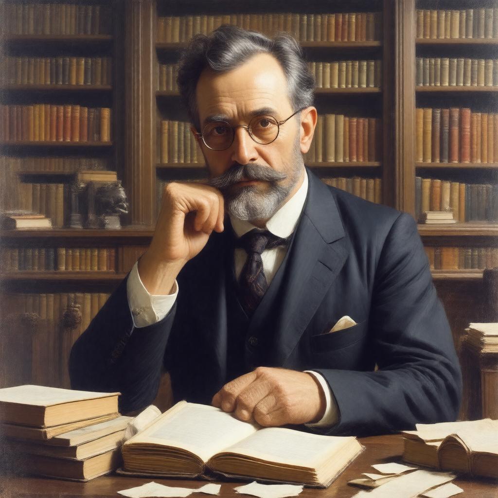 "Generate a realistic portrait of Paul Langevin, a French physicist and professor, in a formal 1920s attire, sitting in a library with books and papers around him, with a thoughtful expression, in a style reminiscent of classic French portraiture."