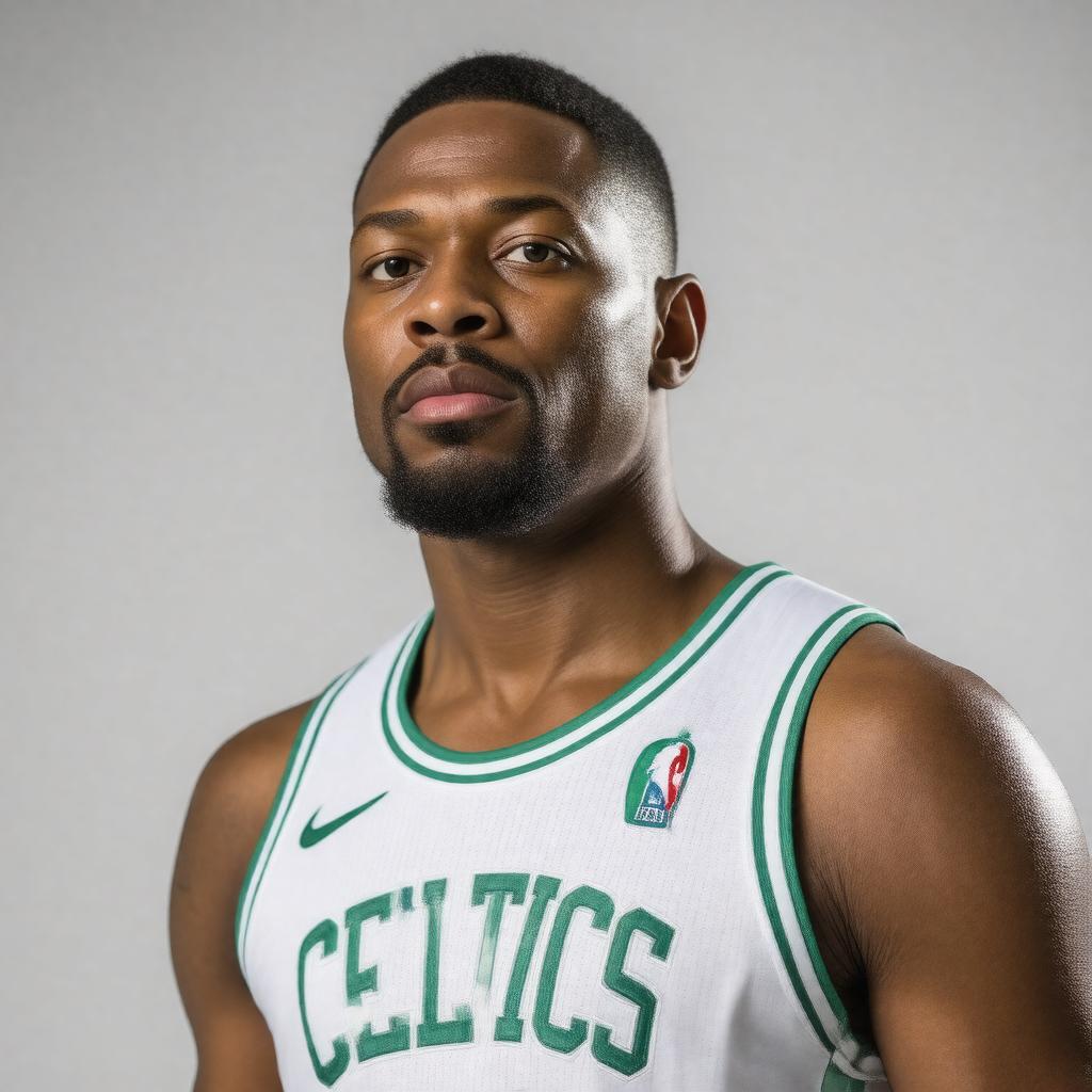 "Generate a realistic portrait of Paul Pierce, an American professional basketball player, in his Boston Celtics uniform, with a confident expression, showcasing his height and athletic build, with a subtle hint of his nickname 'The Truth' in the background, in a sports photography style."