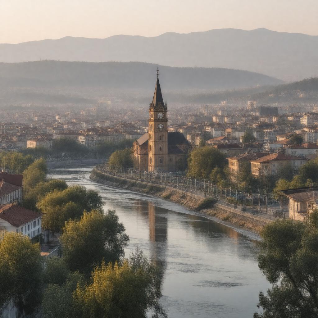 Generate a realistic image of Pazardzhik, a city in Bulgaria, showcasing its cityscape with the Church of the Dormition of the Mother of God and the Clock Tower in the foreground, with the Maritsa river flowing through the city, under a clear sky with a subtle haze, in a daytime setting with warm, natural colors.