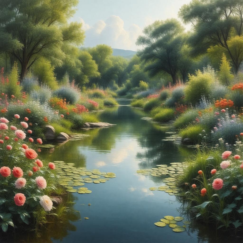 "Generate an image of a serene and beautiful garden with vibrant flowers and a tranquil pond, surrounded by lush greenery, with a subtle outline of the North Dakota state border in the background, representing the nickname 'Peace Garden State' of North Dakota, in a realistic and picturesque style."