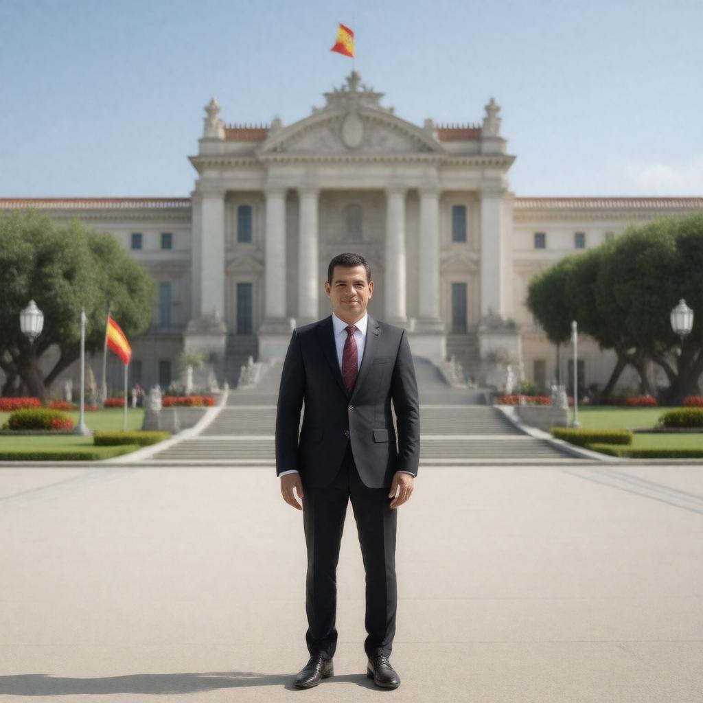 "Generate a realistic image of Pedro Sánchez, the Prime Minister of Spain, standing in front of the Palacio de la Moncloa, with a subtle smile and a confident demeanor, wearing a formal suit and tie, with the Spanish flag in the background, in a photorealistic style."