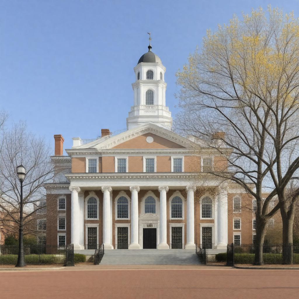 "Generate an image of the Pennsylvania State House, also known as Independence Hall, located at 520 Chestnut Street in Philadelphia, Pennsylvania, United States. The building should be depicted in a realistic Georgian architecture style, with a focus on its historic significance as the meeting place of the Second Continental Congress, the signing of the Declaration of Independence, and the United States Constitution. The image should show the building's exterior, including its bell tower, which formerly housed the Liberty Bell. The scene should be set during the daytime, with a clear blue sky and minimal people in the surrounding area, emphasizing the building's grandeur and historical importance."