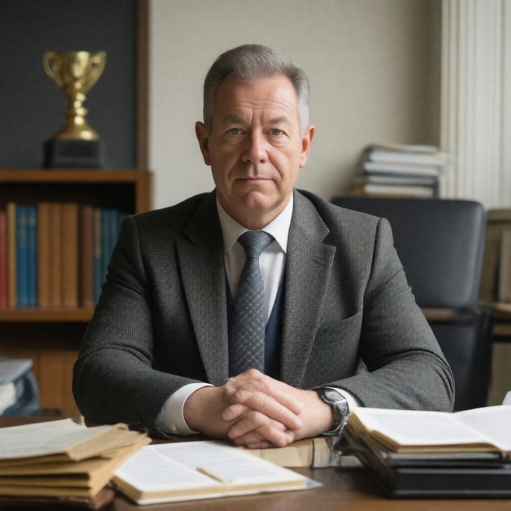 Create a realistic portrait image of Peter Morgan, a middle-aged British man with a professional demeanor, sitting in a well-lit study or office surrounded by books and papers, with a subtle background that hints at his connection to the film and television industry, such as a framed award or a script on a nearby table, wearing attire that reflects his British heritage and professional occupation as a screenwriter, playwright, and producer.