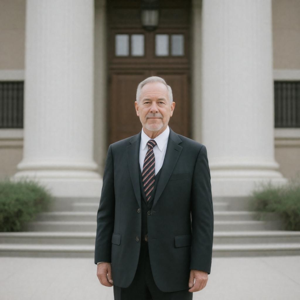 Generate a realistic image of a middle-aged man in formal academic attire, likely standing in front of a university building, representing Peter W. Stanley, the former President of Pomona College.