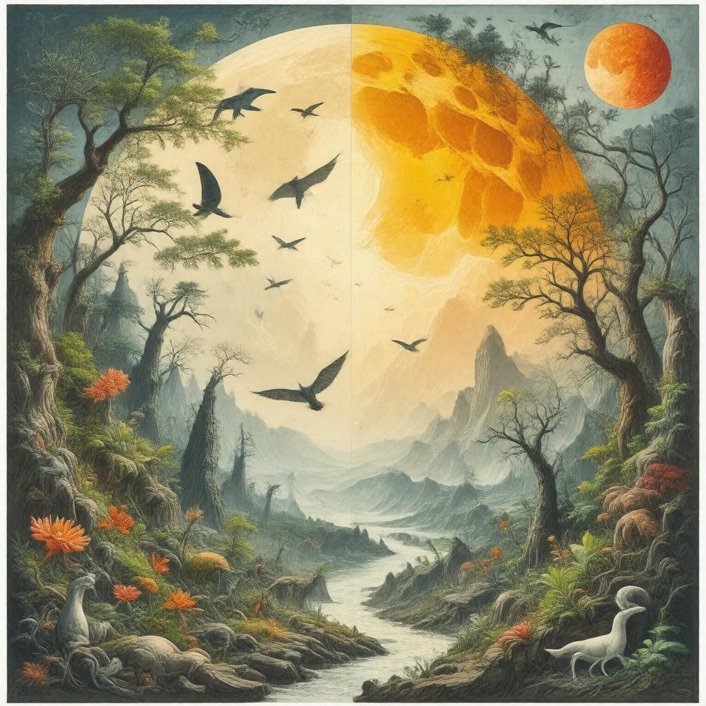 "Generate an image representing the Phanerozoic Eon, a geological eon characterized by abundant animal and plant life, spanning from 541 million years ago to the present. Depict a diverse array of life forms, including ancient and modern plants and animals, in a dynamic and evolving landscape. Incorporate visual elements that signify major events such as the Cambrian explosion, Permian-Triassic extinction event, and Cretaceous-Paleogene extinction event. Use a style that conveys the immense timescale and biological diversity of this eon, such as a dramatic and colorful illustration with multiple layers or a collage of different ecosystems."