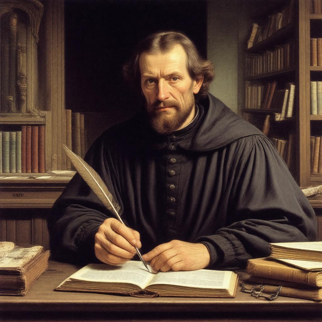 Generate an image of Philip Melanchthon, a 16th-century German theologian and scholar, sitting at a desk with a quill in hand, surrounded by books and papers, wearing traditional attire of the time, with a calm and introspective expression, in a realistic style reminiscent of Lucas Cranach the Elder's portrait of him.