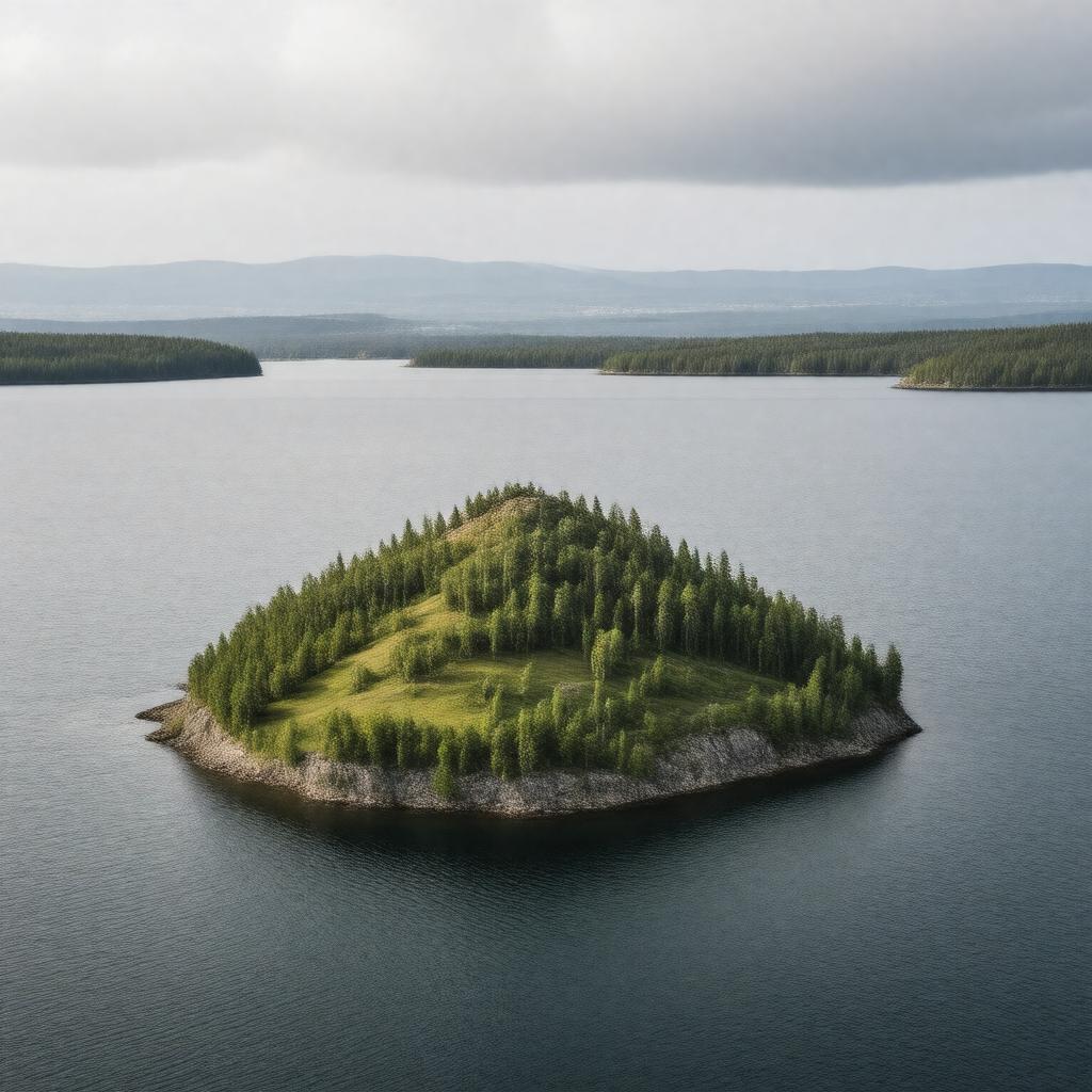 "Generate a realistic image of a small, uninhabited, pie-shaped island in Lake Superior, with a prominent Mount Pie in the center, surrounded by water and with a view of Thunder Bay in the distance, under a serene and natural lighting, in a style suitable for a geographical representation."
