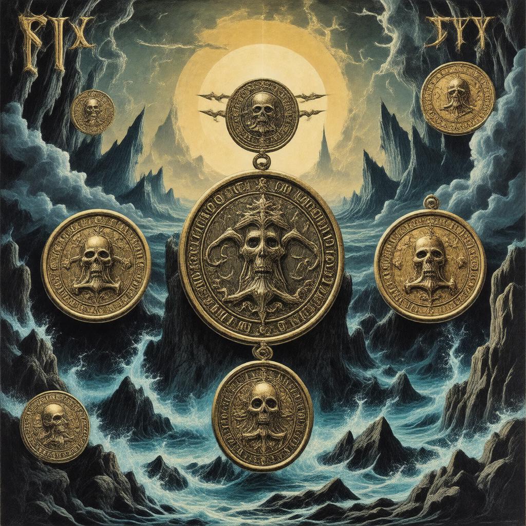 "Generate an image of the album cover of 'Pieces of Eight' by Styx, a progressive rock band, released in 1978, featuring a stylized illustration of eight coins or pieces of eight, surrounded by dark, mystical, and adventurous elements, in a fantasy art style, with a sense of grandeur and drama, reflecting the album's themes and music."