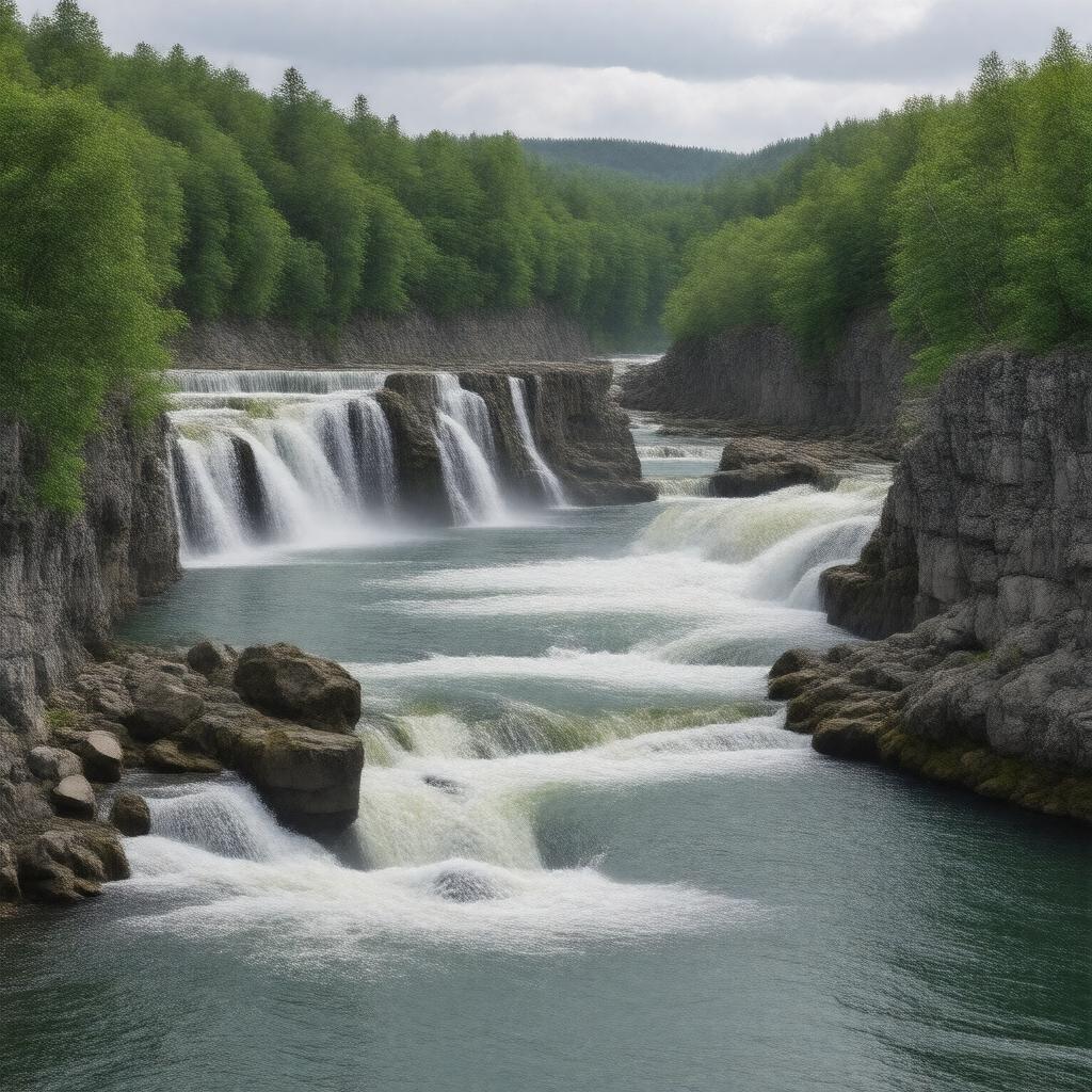 "Generate an image of a serene river flowing through a scenic landscape, with a 31-mile stretch connecting South Lake to Lake Superior, passing through Grand Portage State Park and Pigeon River Provincial Park, and featuring notable waterfalls such as High Falls and Middle Falls, in a realistic style."