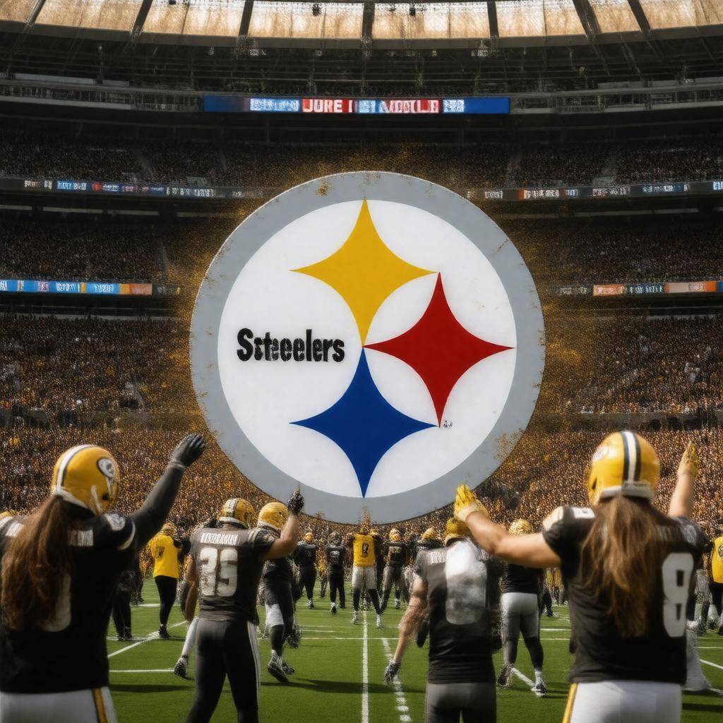 "Generate an image of the Pittsburgh Steelers American football team logo or a scene depicting the team in action, with a predominantly black and gold color scheme, in front of the Acrisure Stadium, with a subtle Steelmark logo in the background, and a few fans waving Terrible Towels, in a realistic style."
