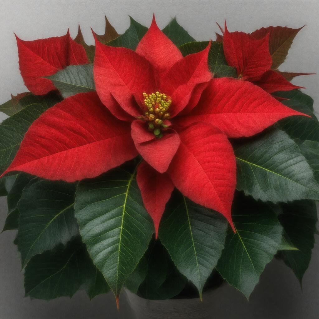 "Generate an image of a vibrant Poinsettia plant (Euphorbia pulcherrima) in a festive holiday setting, with bright red bracts and lush green leaves, symbolizing Christmas in North America, in a realistic style, with a shallow depth of field to emphasize the plant's beauty."