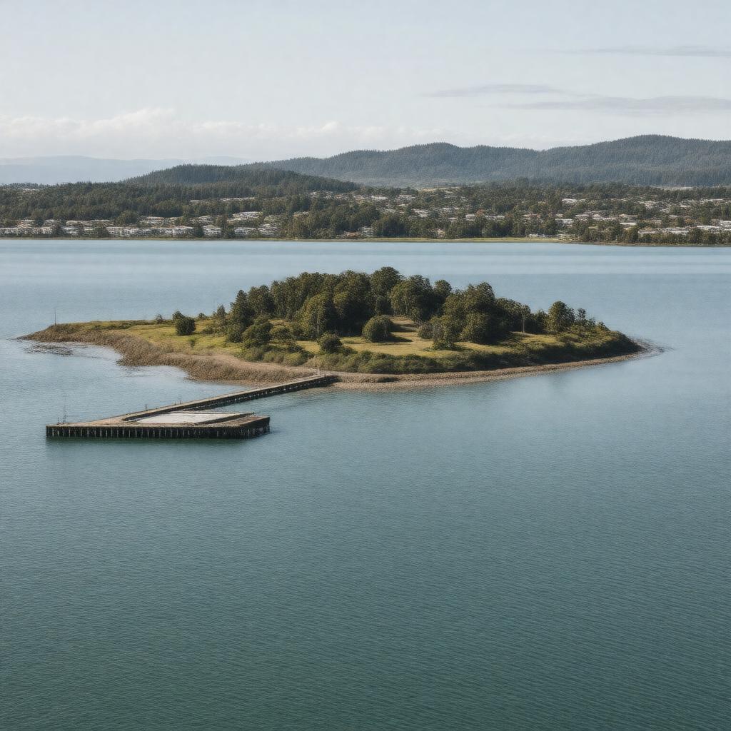 Generate a realistic image of a serene island in a harbor, with a wharf and a water treatment plant visible on its shore, surrounded by calm waters and with a suburban area in the background, under a clear New Zealand sky.