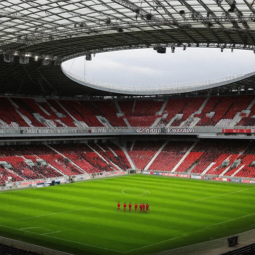 Generate an image of a football stadium with a black, white, and red color scheme, specifically Stadion Polonii Warszawa in Warsaw, Poland, with a capacity of 7,150, featuring the team's nickname "Czarne Koszule" prominently displayed, and a group of football players in black, white, and red uniforms standing on the field, with the Warsaw cityscape in the background, in a realistic and dynamic style.