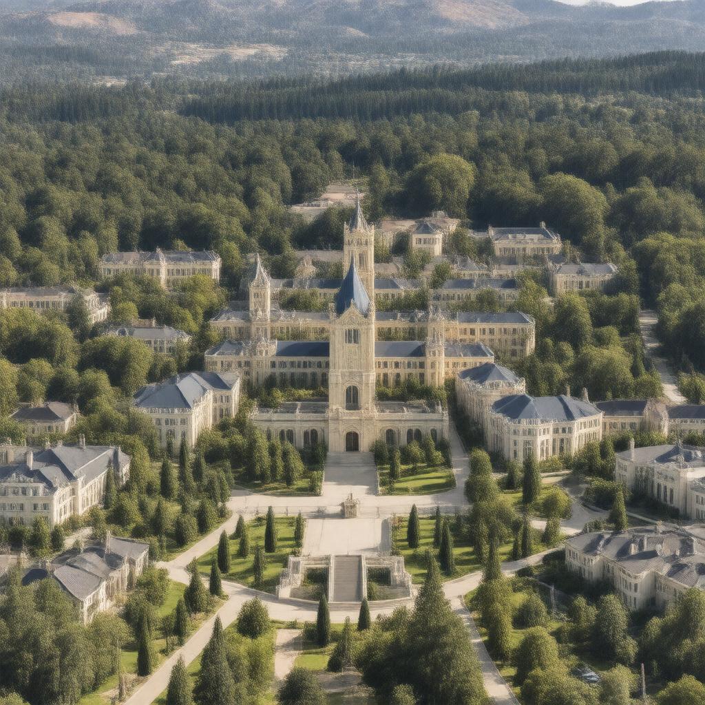 "Generate an image of a beautiful, suburban college campus with a mix of modern and historic buildings, featuring a blend of blue and gold architectural elements, situated on a 140-acre landscape with lush greenery, representing Pomona College, a private liberal arts college located in Claremont, California, with a student body of approximately 1,700, founded in 1887."