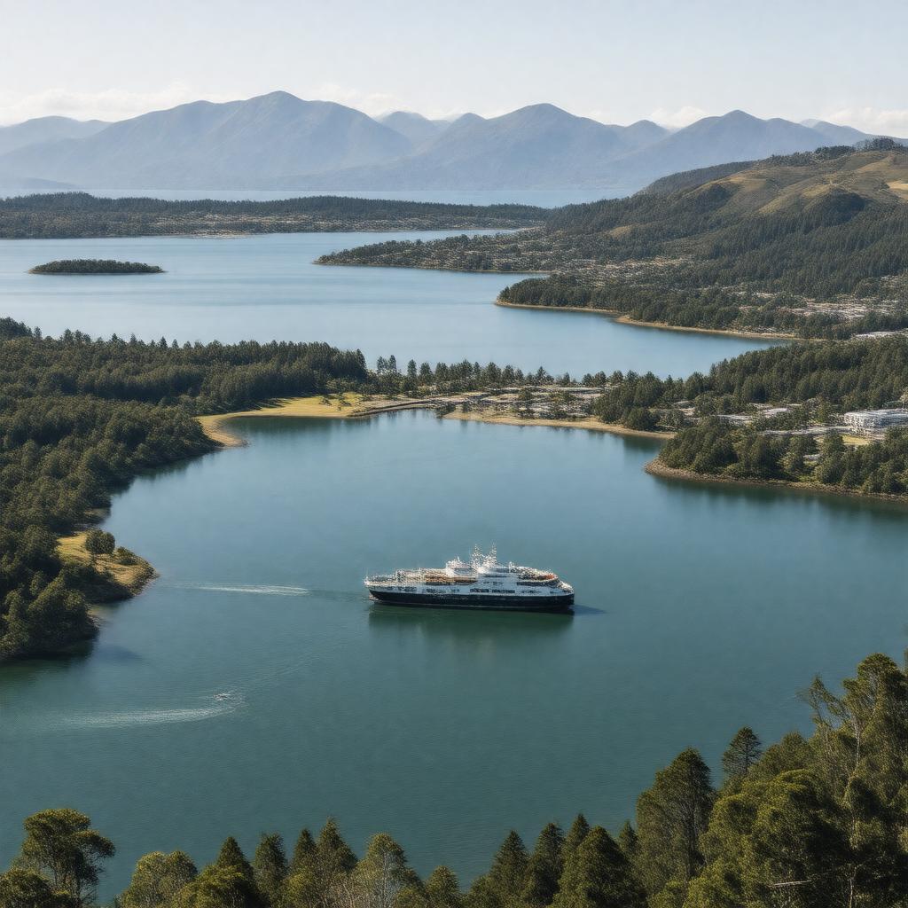 "Generate a realistic image of a large marina in New Zealand, surrounded by hills and mountains, with several islands visible inside, including Somes Island and Matiu/Somes Island, and a cityscape along its shores, specifically Wellington City, with a ferry operating in the waters, under a clear blue sky, representing Port Nicholson, also known as Wellington Harbour."