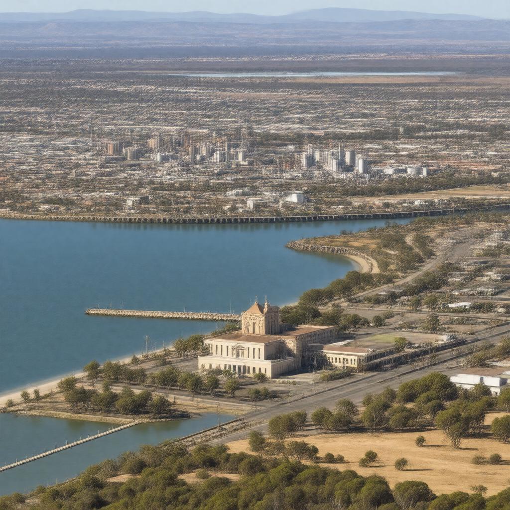 "Generate an image of a panoramic view of Port Pirie, a city located on the shores of Spencer Gulf in South Australia, showcasing its scenic waterfront, industrial areas including the Nyrstar Port Pirie Smelter, and surrounding landscape with a Mediterranean climate, incorporating recognizable landmarks such as the Port Pirie Post Office, Customs House, Railway Station, and St Mark's Cathedral, in a realistic style."
