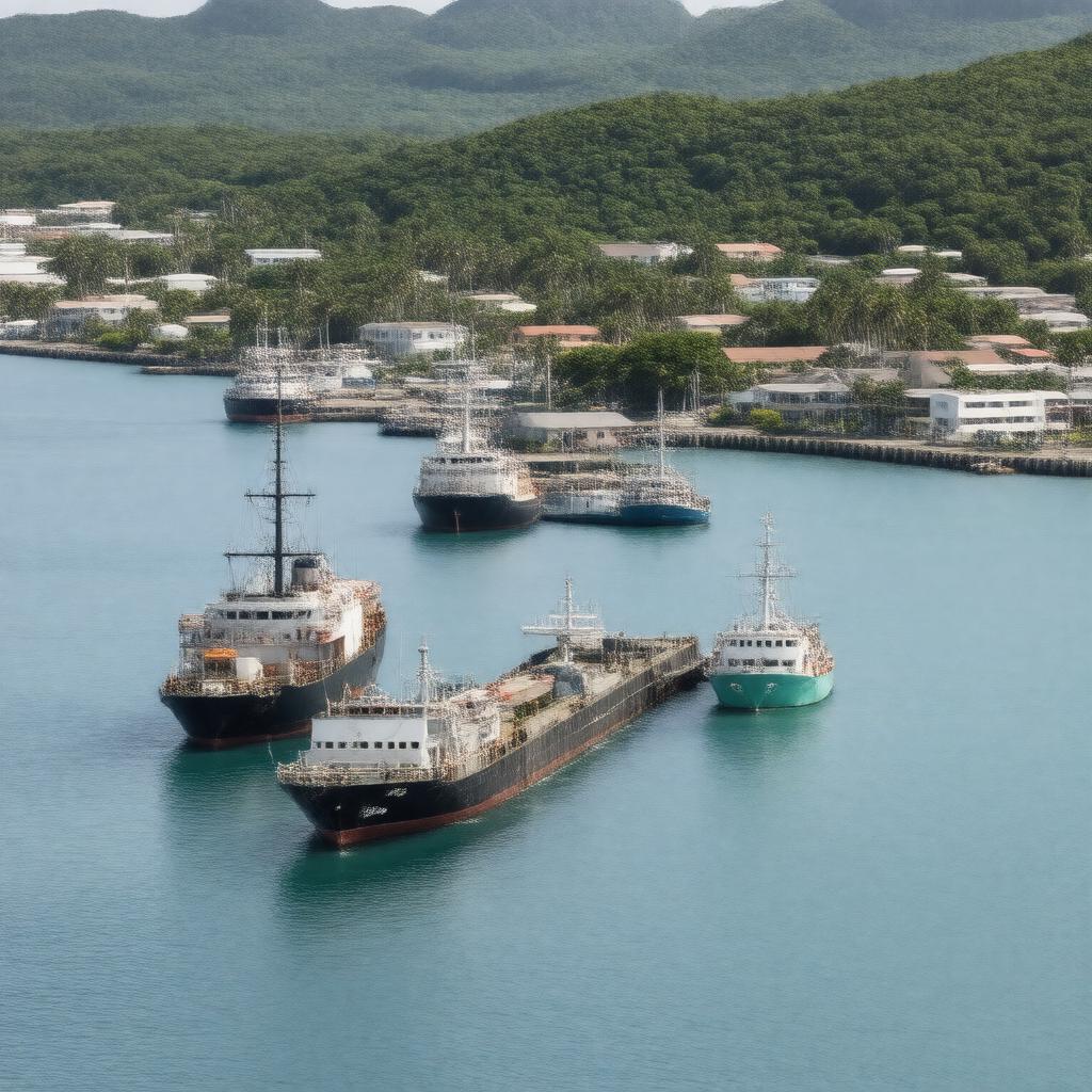 Generate a realistic image of a bustling cargo and ferry port, situated on the coast of Tortola, British Virgin Islands, with several ships and boats docked alongside a small harbor, surrounded by tropical buildings and lush greenery, with Road Harbour visible adjacent to it.