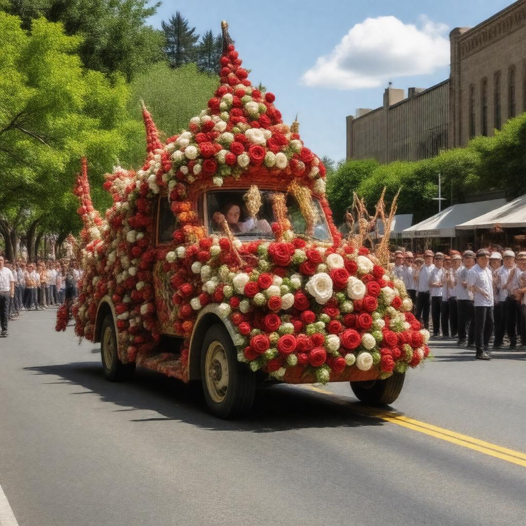 "Generate an image of a vibrant and lively scene of the Portland Rose Festival, showcasing a stunning floral parade with elaborately decorated floats, marching bands, and festive atmosphere, set against the backdrop of Portland, Oregon's lush greenery and sunny skies in late May or early June, with a style that blends realism with a touch of whimsy and playfulness."