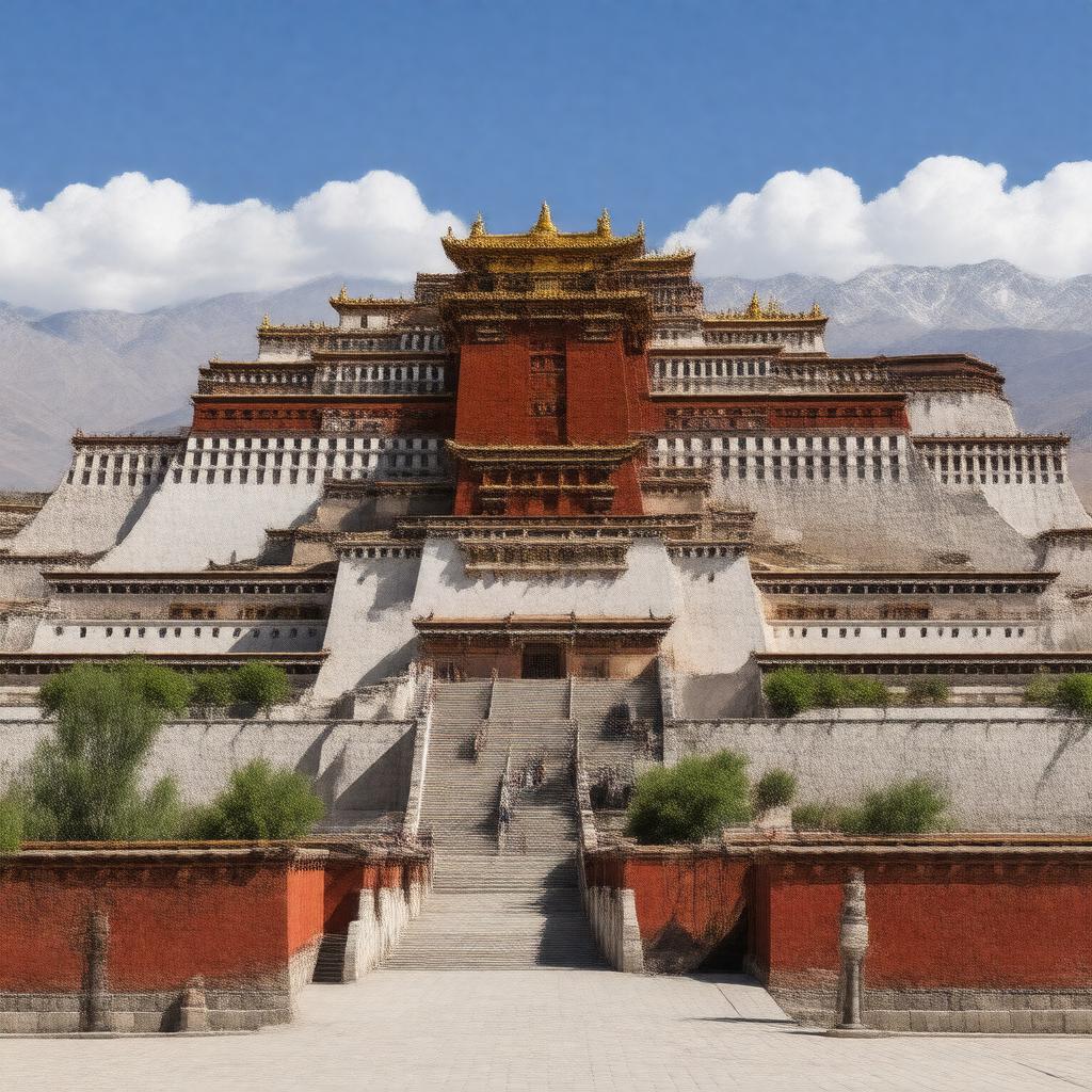 "Generate an image of the Potala Palace, a Tibetan palace located in Lhasa, China, with a mix of Tibetan architectural style, featuring stone, wood, and mud bricks, with gold, red, and white roofs, situated at an elevation of 3,700 meters, surrounded by the Himalayas, with the Red Palace and White Palace prominently visible, and numerous chapels, tombs of Dalai Lamas, frescoes, statues, sacred scriptures, thangkas, jewelry, and a library, set against a clear blue sky with a few clouds, in a realistic and serene style."