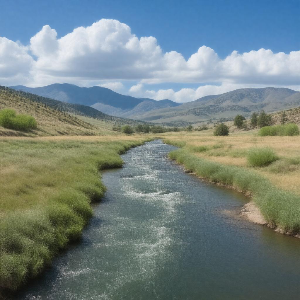 "Generate a serene landscape image of Powder River, a 375-mile-long river in the United States, flowing through a scenic valley surrounded by rolling hills and mountains, with a few trees and bushes along its banks, under a clear blue sky with a few puffy white clouds; the image should be in a realistic style, capturing the natural beauty of the river and its surroundings, with the river's gentle flow and powdery sand banks subtly visible."