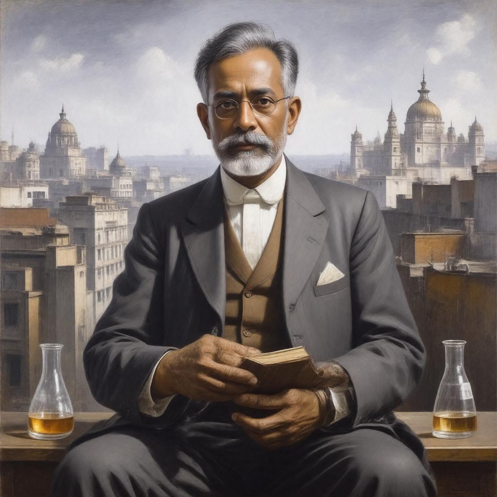 Create a realistic oil-on-canvas portrait of Prafulla Chandra Ray, an Indian chemist, educator, and entrepreneur from the early 20th century, sitting in a dignified pose with a backdrop of Kolkata cityscape, dressed in formal attire, with subtle hints of his notable works, such as a book or a beaker, and an expression that reflects his contributions to Indian chemistry and his legacy.