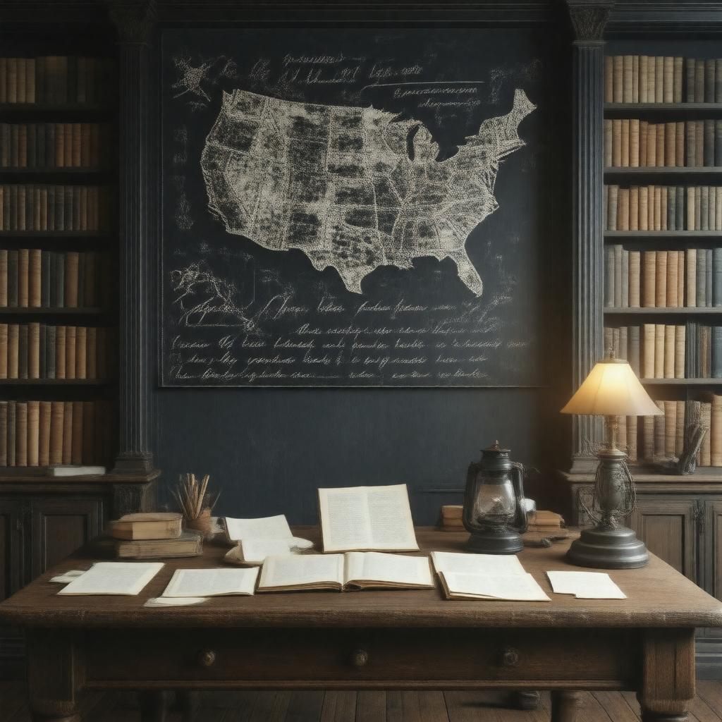 "Create an image of a late 19th-century American-style study with a large, wooden desk in the center, surrounded by bookshelves and faint, chalkboard-style writings on the walls about practical consequences and truth. On the desk, have a few scattered papers with notes and a lantern or a lamp casting a warm, soft light, symbolizing ideas as tools for action. In the background, a subtle image of the United States map or a cityscape should be visible, representing the philosophy's origin and influence. The style should be reminiscent of a classic, intellectual American setting, reflecting the pragmatic approach to truth and meaning. The overall mood should be contemplative and thoughtful, capturing the essence of pragmatism as a philosophy focused on practical effects and consequences."