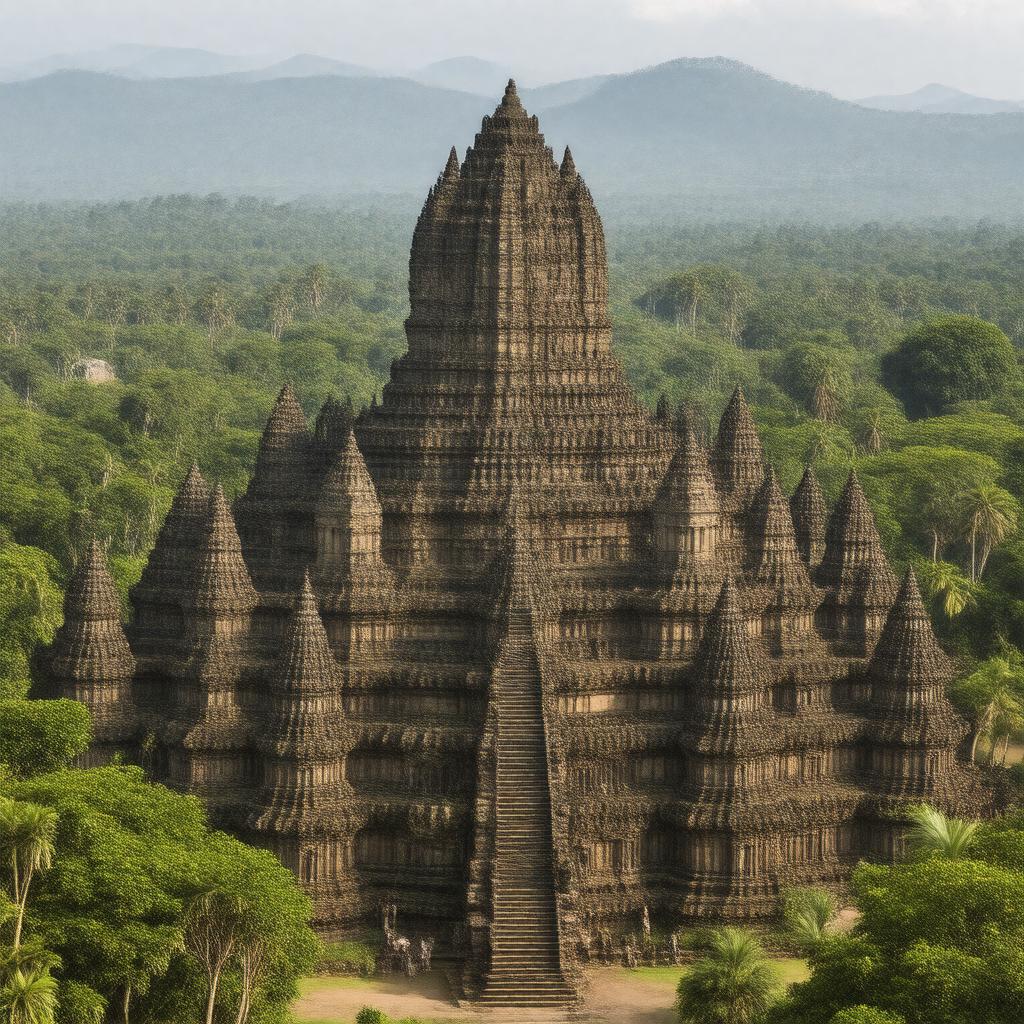 "Generate an image of a majestic Hindu temple complex with tall and pointed architecture, situated in a lush landscape, representing Prambanan, a 9th-century Hindu temple located in Central Java, Indonesia, with its iconic Shiva temple standing 47 meters high, surrounded by 240 temples, and adorned with intricate carvings depicting scenes from the Ramayana and Bhagavata Purana."