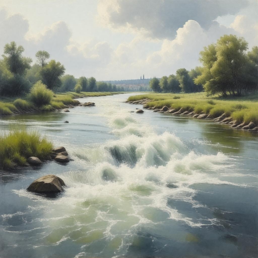 "Generate a realistic image of a river flowing through a landscape, specifically depicting the Pregolya River in Kaliningrad Oblast, Russia, with a serene atmosphere and showcasing its surroundings, including the city of Kaliningrad in the background, with a watercolor or landscape painting style."