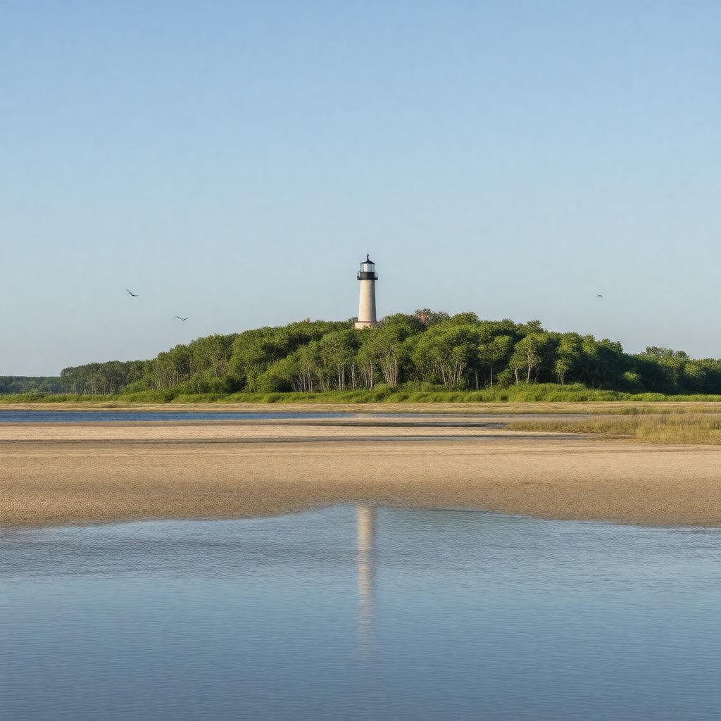 "Generate an image of a serene and natural sandy peninsula with beaches, lagoons, and marshes, featuring a historic lighthouse in the background, surrounded by lush greenery and trees, with migratory birds flying overhead, under a clear blue sky, representing Presque Isle State Park, a nature reserve located in Erie, Pennsylvania, United States."