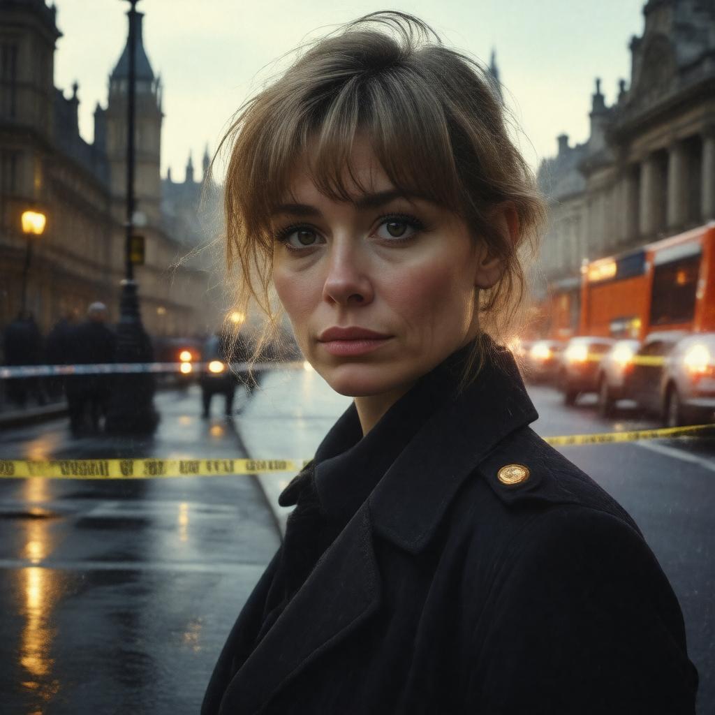 "Generate an image of a crime scene in London, with a police detective, inspired by the character Jane Tennison, standing in the foreground, looking determined and focused on solving a murder investigation, with a cityscape and police tape in the background, representing the British crime drama television series 'Prime Suspect', in a realistic and gritty style."