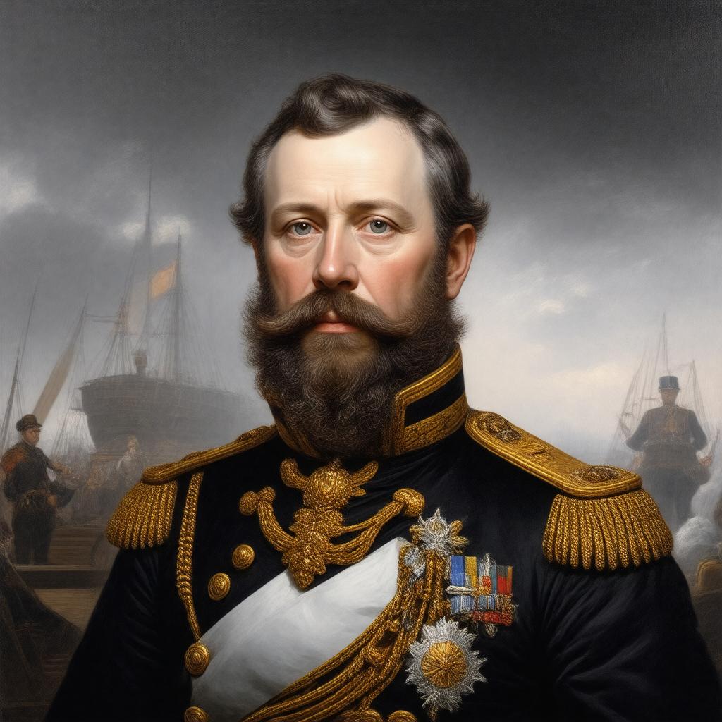 "Generate a realistic portrait of Prince Alfred, Duke of Saxe-Coburg and Gotha, dressed in formal attire, with a naval background, reflecting his rank as Admiral in the Royal Navy, in a style reminiscent of 19th-century European portraiture."