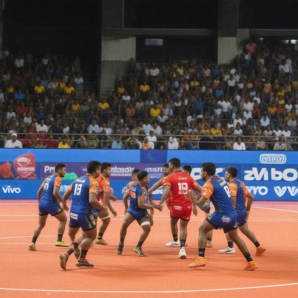 "Generate an image of a professional kabaddi match with 12 players on the field, surrounded by a large crowd, with a stadium in the background and a prominent display of the Pro Kabaddi League logo, incorporating the colors of the league and the Vivo title sponsor logo, in a realistic and dynamic style."