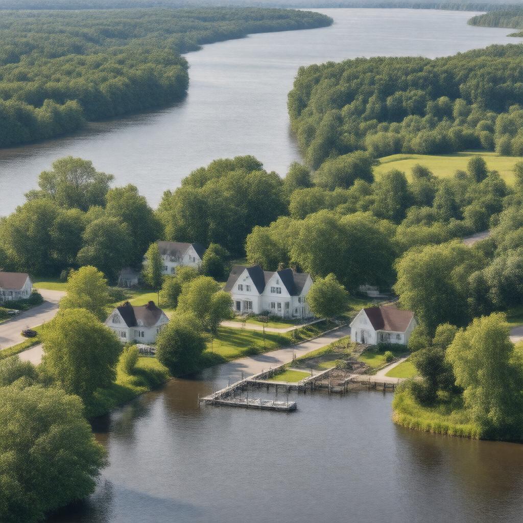 Generate a realistic image of a small village situated on the banks of a river, with a few buildings, homes, and trees, representing Proctorville, a village in Lawrence County, Ohio, with a population of 574 as of 2020. The image should showcase a tranquil and rural atmosphere, with a scenic view of the Ohio River in the background. The village should be depicted with a few streets, a town hall or municipal building, and some residential homes, all surrounded by lush greenery and possibly a few boats or docks along the riverbank. The style should be a mix of photographic realism with a slightly warm and inviting tone, capturing the essence of a small American village.