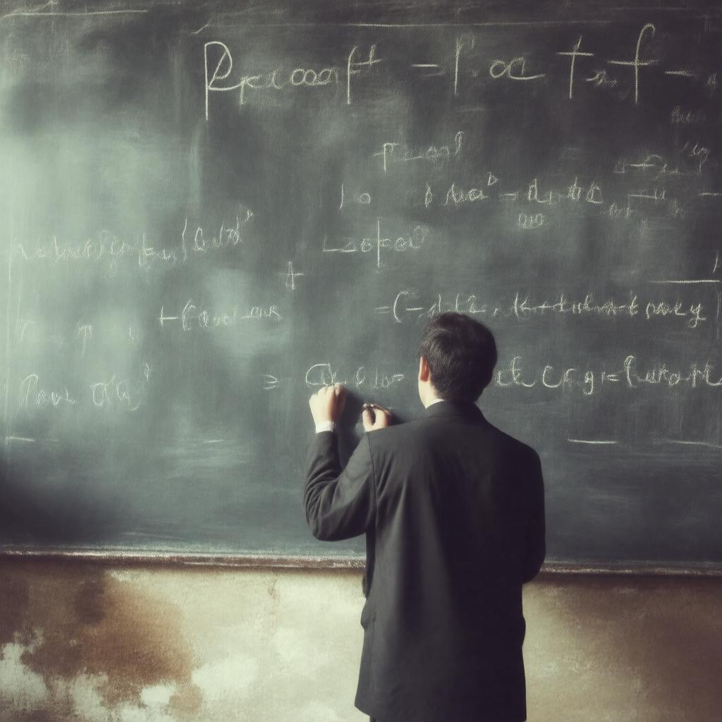 Generate an image of a film titled "Proof", featuring a mathematician working on a complex equation on a blackboard, with a subtle film noir-inspired aesthetic, conveying a sense of mystery and intellectual pursuit.