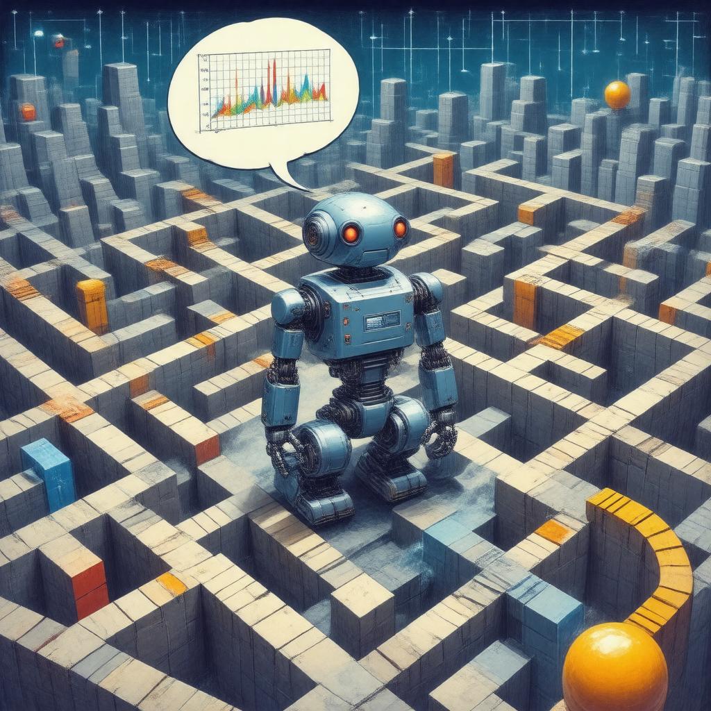 "An illustration of a robot learning to navigate a maze using Q-learning, a model-free reinforcement learning algorithm. The robot is shown in the center of the maze, with a thought bubble displaying a Q-value table. The maze has several paths and rewards, represented by different colors and symbols. In the background, a graph shows the convergence of the Q-learning algorithm to an optimal policy. The style is a futuristic, technical illustration with a mix of digital and robotic elements."
