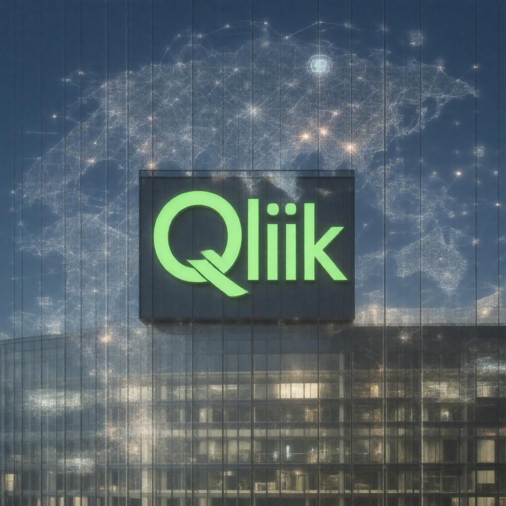 "Create an image of a modern, sleek corporate logo and office building representing Qlik, a business intelligence and data analytics company, with a subtle nod to its Swedish and American roots, set against a backdrop of interconnected data streams and analytics graphs, symbolizing its role in data integration and analytics, in a professional and realistic style."
