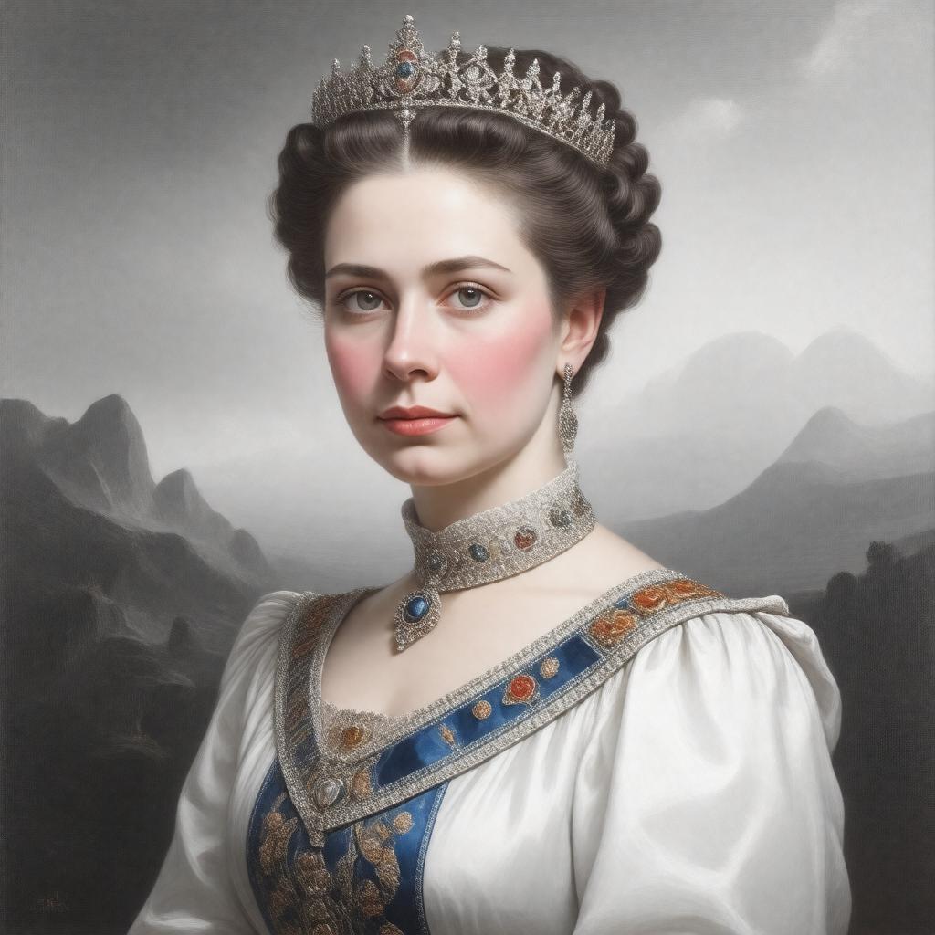"Generate a realistic portrait of Queen Maud of Norway, dressed in formal attire befitting her role as Queen consort, set against a backdrop that subtly suggests her connection to Norway, incorporating elements that reflect her British and Danish heritage."