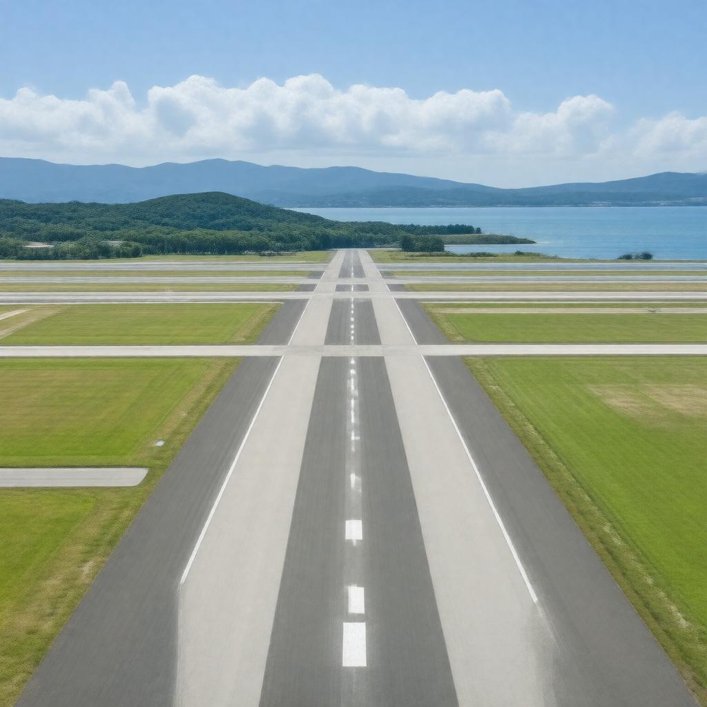 Generate a realistic image of Oki Airport (RJAL) located in Okinoshima, Shimane Prefecture, Japan, showcasing its asphalt runway and surrounding landscape with a small island scenery in the background, under a clear blue sky with a few puffy white clouds.