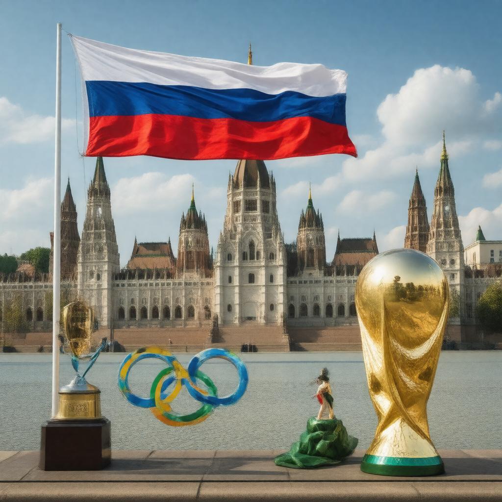 "Generate an image of the Russian Federation's national flag waving in front of the Kremlin, with the Olympic rings and a FIFA World Cup trophy nearby, set against a backdrop of a map of Russia with ISO 3166-1 alpha-3 code 'RUS' displayed prominently, in a realistic and symbolic style."