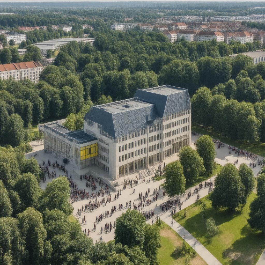 "Create a realistic image of the main building of RWTH Aachen University, a public university located in Aachen, Germany, with a mix of modern and historical architectural styles, surrounded by lush greenery and with a large number of students and faculty members in the background, incorporating the university's colors, blue and yellow, in the design, with a subtle nod to its motto 'Zukunft denken' (Thinking the Future)."