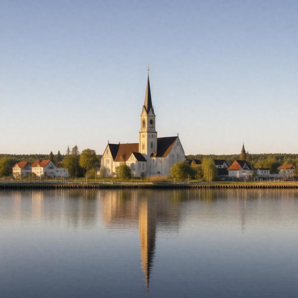"Generate a realistic image of Raahe, a city located on the Gulf of Bothnia in Northern Ostrobothnia, Finland, showcasing its Old Town, Raahe Church, and waterfront, with a serene atmosphere and a hint of Nordic charm."