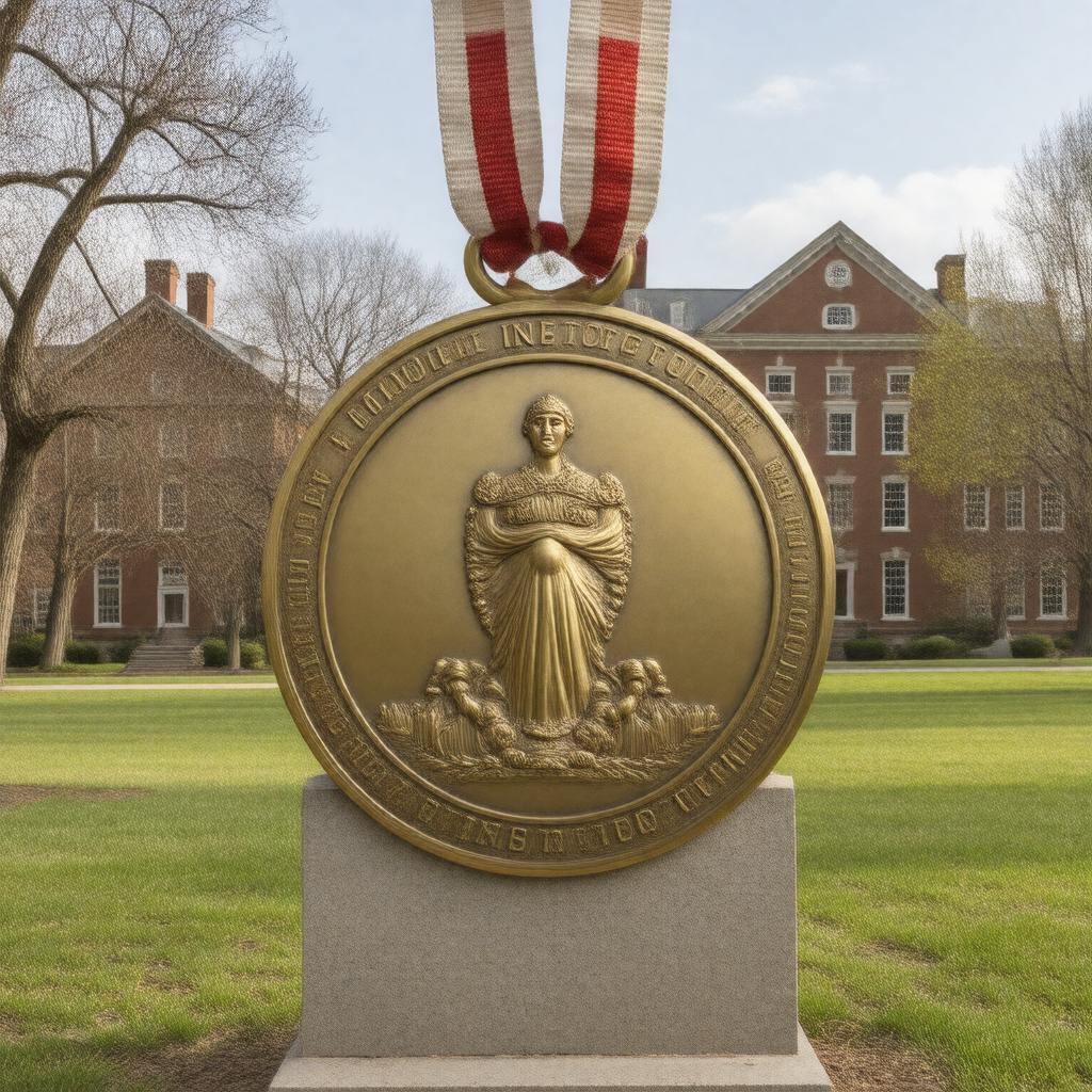 "Generate an image of a prestigious medal with a elegant design, set against a backdrop of the Harvard University campus in Cambridge, Massachusetts, with the Radcliffe Institute for Advanced Study architecture subtly visible, symbolizing excellence and transformative impact on society, awarded annually by the Radcliffe Institute for Advanced Study, with a sense of tradition and achievement."