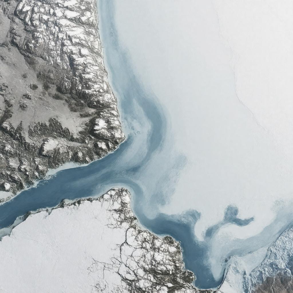 "Generate a realistic map image of Rae Strait, a narrow waterway in the Canadian Arctic Archipelago, separating King William Island from Boothia Peninsula, with surrounding icy landscape and faint outlines of nearby islands, in a muted color palette reminiscent of satellite imagery, with clear indications of its connection to Victoria Strait and Simpson Strait."