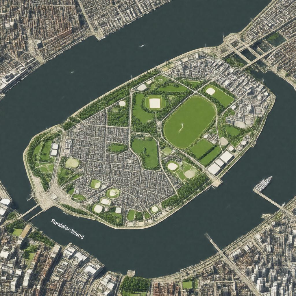 "Generate a realistic image of Randalls Island, a 432-acre island located in New York City, with the East River surrounding it, and the Robert F. Kennedy Bridge and Wards Island Bridge connecting it to other boroughs, showcasing its lush parks, sports facilities, and wildlife areas, in a daytime setting with a mix of natural and urban elements."