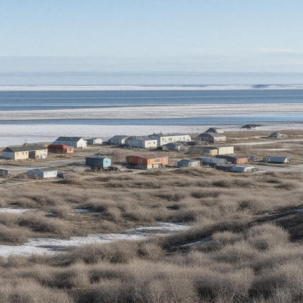 "Generate a realistic image of a small hamlet situated on the shores of Hudson Bay, with a backdrop of Arctic landscape and possibly some mining infrastructure in the distance, incorporating Inuit architectural elements and a few buildings such as the Rankin Inlet Arena, Rankin Inlet Health Centre, and Nunavut Arctic College, under a subarctic climate sky."
