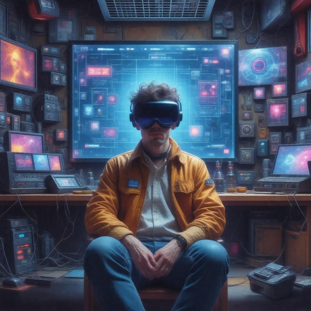 "Generate an image of a dystopian futuristic scene set in 2045, depicting Wade Watts, the main character of Ready Player One, sitting in front of a large screen with the OASIS interface displayed, surrounded by various pop culture icons and virtual reality equipment, with a nostalgic and retro-futuristic style, in a digital art style reminiscent of concept art."