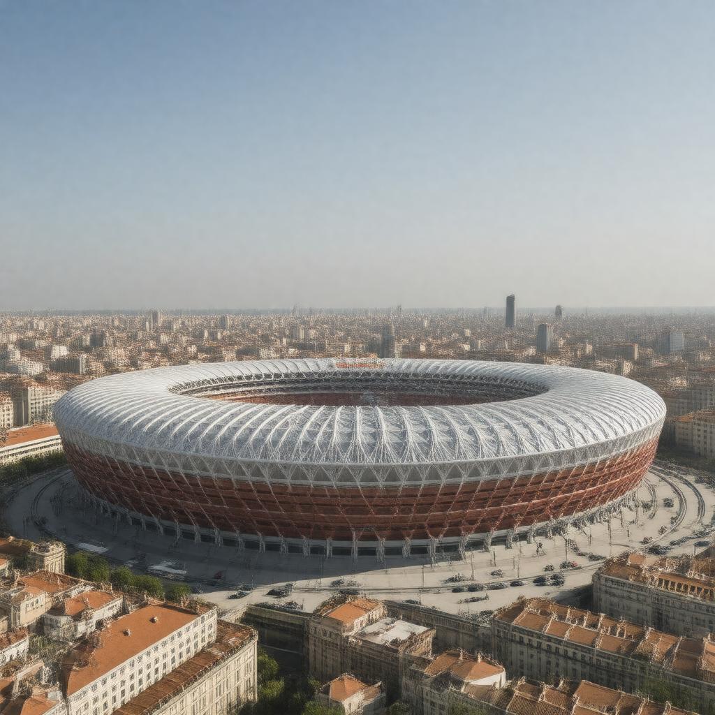 "Generate an image of the iconic Santiago Bernabéu Stadium, home of Real Madrid CF, with the team's logo and colors prominently featured, set against a backdrop of the vibrant city of Madrid, Spain, in a realistic and dynamic style."