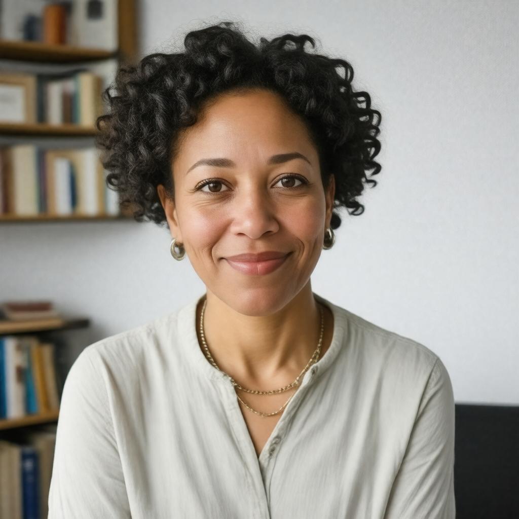Create a realistic portrait of Rebecca Walker, a female American writer, feminist, and activist, in a style that reflects her personality and professional accomplishments. Depict her as a confident and introspective woman in her mid-50s, with a warm and approachable smile. She should be dressed in modern, comfortable clothing, possibly with a few subtle hints at her Jewish and African-American heritage. The background should evoke a sense of creativity and intellectual pursuits, such as a cozy study or library. Incorporate subtle nods to her literary works and her involvement in Third Wave Feminism.